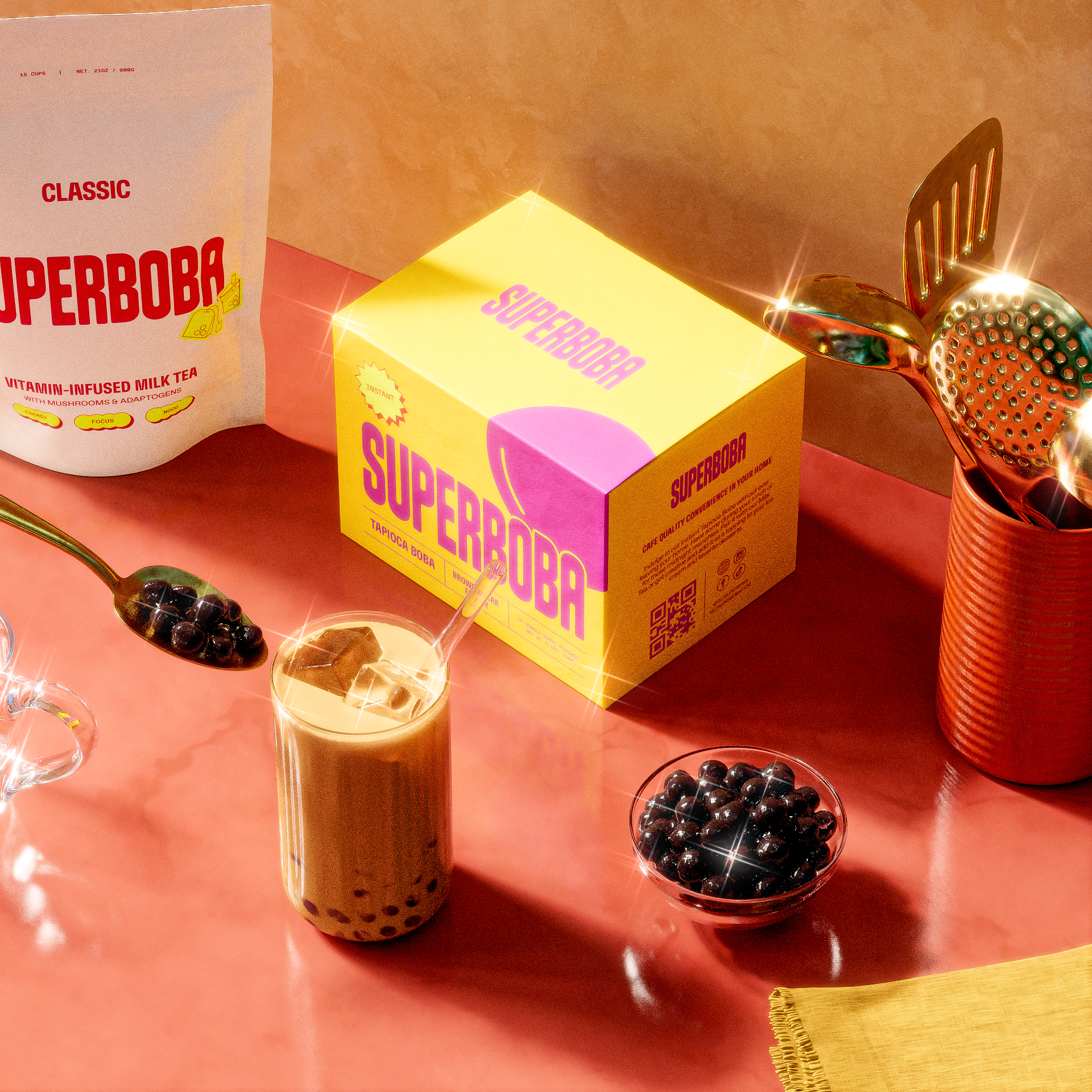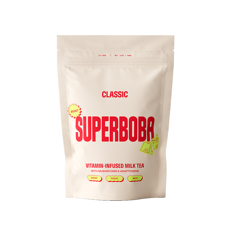 The functional mushrooms in Super Boba are Lion’s Mane and Cordyceps. Lion’s Mane is known for increasing our levels of brain-derived neurotrophic factor (BDNF) which enhances our cognitive function and memory, while Cordyceps is renowned for its ability to increase energy levels and promote overall vitality and well-being.
